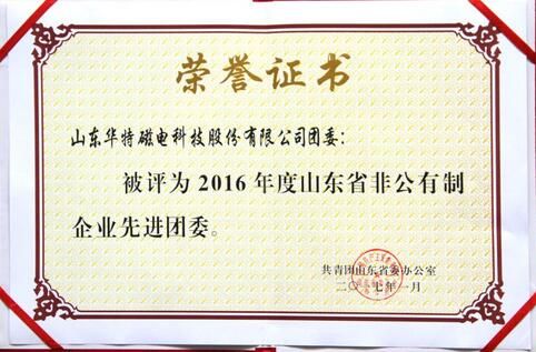 近日,山東華特磁電科技股份有限公司團委被團省委授予“2016年度山東省非公有制企業先進團委”榮譽稱號,公司團委連續兩年獲此殊榮。