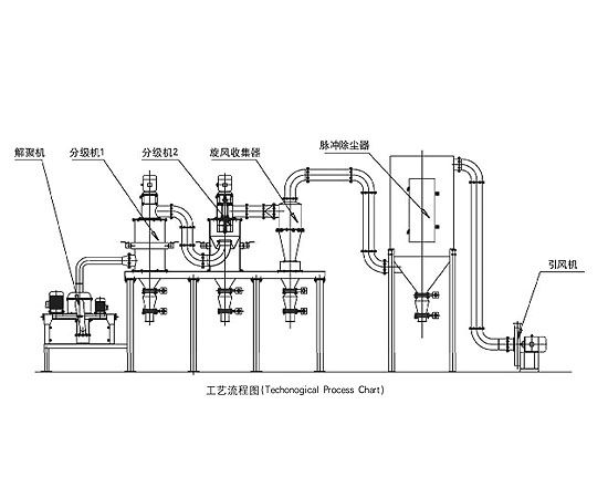 該生產(chǎn)線由解聚機(jī)、分級機(jī)、旋風(fēng)收集器、脈沖除塵器、引風(fēng)機(jī)、電控柜等組成,物料由原料倉進(jìn)入解聚機(jī)進(jìn)行粉碎,粉碎后的物料在引風(fēng)機(jī)引力的作用下經(jīng)輸料管進(jìn)入分級機(jī)分級,符合粒度要求的產(chǎn)品進(jìn)入旋風(fēng)收集器收集,粗料從分級機(jī)下口排出,過細(xì)的粉料在脈沖除塵器收集,潔凈的氣體由引風(fēng)機(jī)排出。
